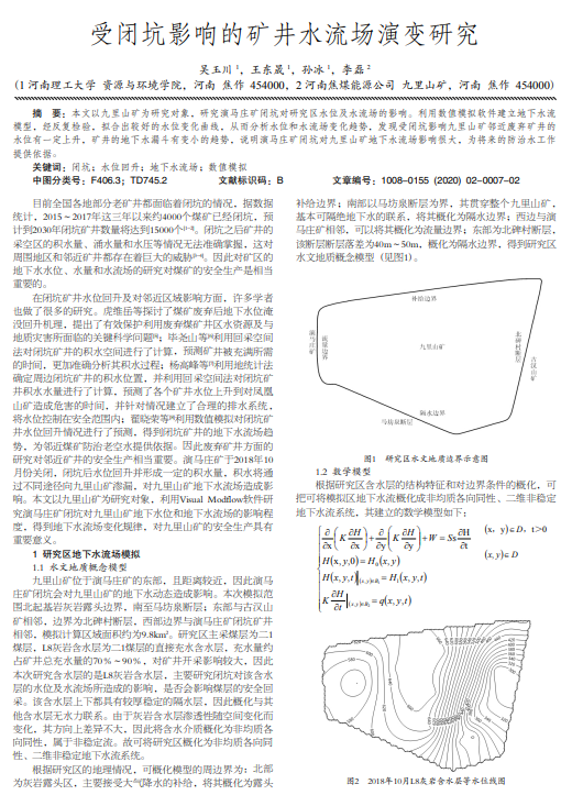 本文以九里山矿为研究对象,研究演马庄矿闭坑对研究区水位及水流场的影响。利用数值模拟软件建立地下水流 模型,经反复检验,拟合出较好的水位变化曲线,从而分析水位和水流场变化趋势,发现受闭坑影响九里山矿邻近废弃矿井的 水位有一定上升,矿井的地下水漏斗有变小的趋势,说明演马庄矿闭坑对九里山矿地下水流场影响很大,为将来的防治水工作 提供依据。