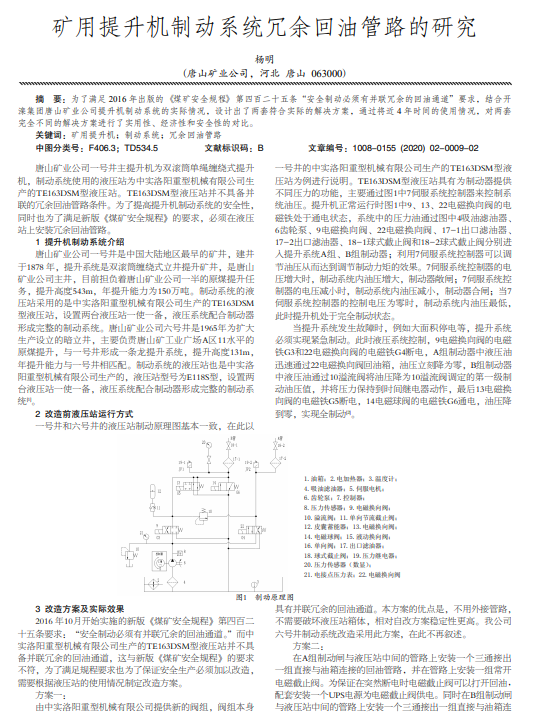 为了满足 2016 年出版的 《煤矿安全规程》 第四百二十五条“安全制动必须有并联冗余的回油通道”要求,结合开 滦集团唐山矿业公司提升机制动系统的实际情况,设计出了两套符合实际的解决方案,通过将近 4 年时间的使用情况,对两套 完全不同的解决方案进行了实用性、经济性和安全性的对比。