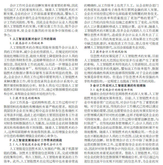 信息网络技术的深入发展促进了人工智能技术的发展。目前人工智能技术在会计领域得到了广泛的应用,对会计领域产生了重要的影响。