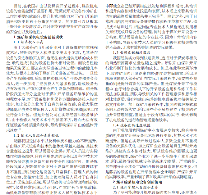 随着我国经济水平的不断提升,在矿山煤炭资源开采过程中,机电设备直接影响矿产煤炭开采的质量,对矿产煤炭的开采起到了重要的实际作用和现实意义。