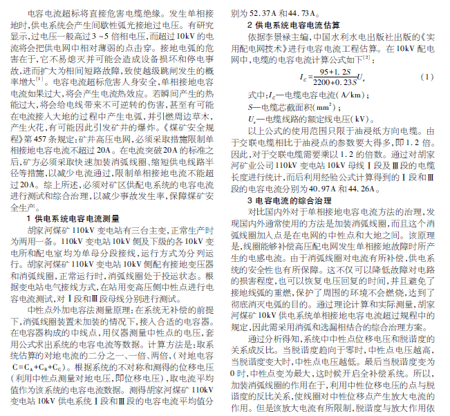 彬长矿区胡家河矿 供电系统电容电流测试及治理方案