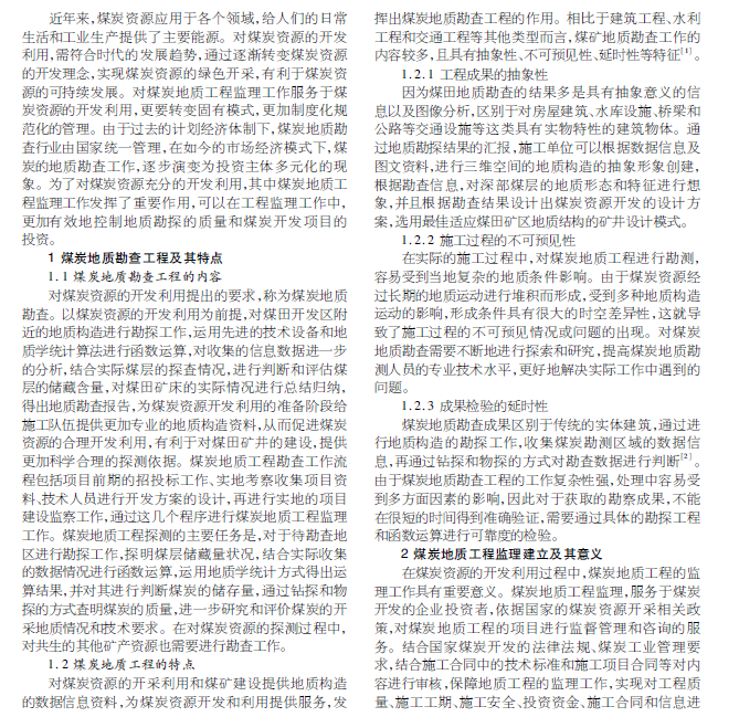 随着我国工业化进程的不断加快,对煤炭资源的需求日益增长,而对煤炭地质工程开发是发展煤炭行业的基础,关系到煤田工程的质量。