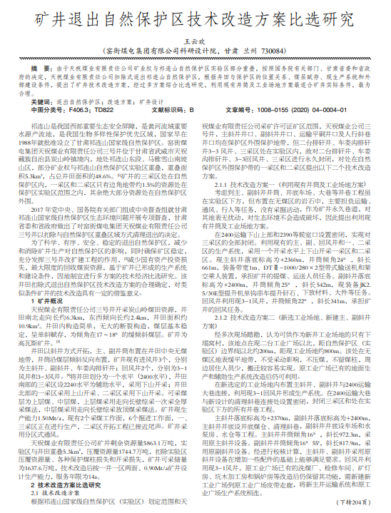 由于天祝煤业有限责任公司矿业权与祁连山自然保护区实验区部分重叠,按照国务院有关部门、甘肃省委和省政 府的决定,天祝煤业有限责任公司扣除式退出祁连山自然保护区,根据井田与保护区的位置关系、煤层赋存、现生产系统和外 部建设条件,提出了矿井技术改造方案,经过多方案综合比选研究,利用现有井筒及工业场地方案最适合矿井实际条件,最为合理。