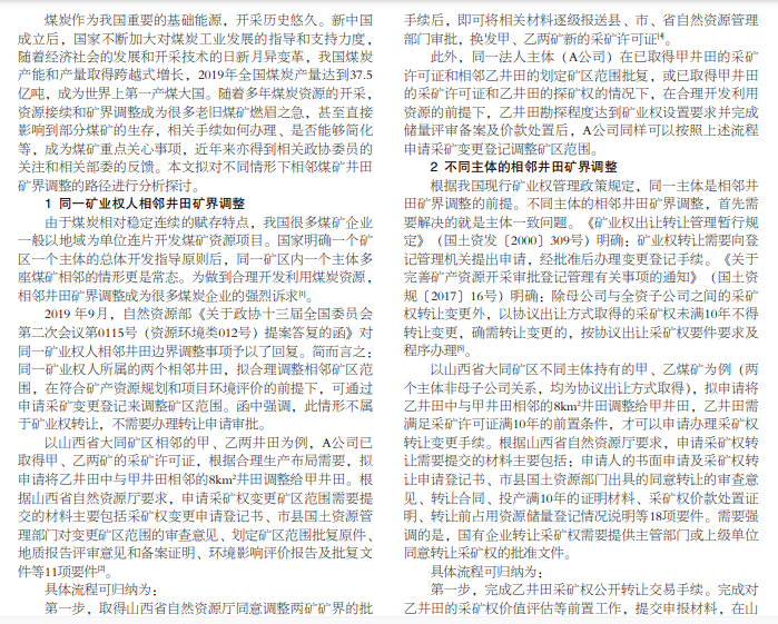 相邻煤矿井田矿界调整是很多煤炭企业特别是老旧矿山在生产接续中急需解决的难题,由于办理手续繁杂、周期 长、难度大,很多煤炭企业望而却步。本文结合相关案例,对不同情形下矿界调整的路径进行分析梳理,以供相关煤炭企业参 考。