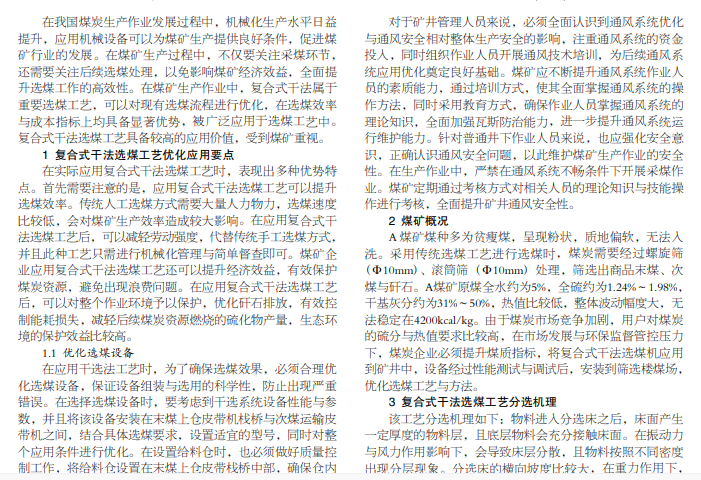 此次研究按照复合式干法选煤工艺机理,结合具体煤矿的煤质与生产需求,优化选煤设备与技术工艺,提升煤炭 的经济效益。