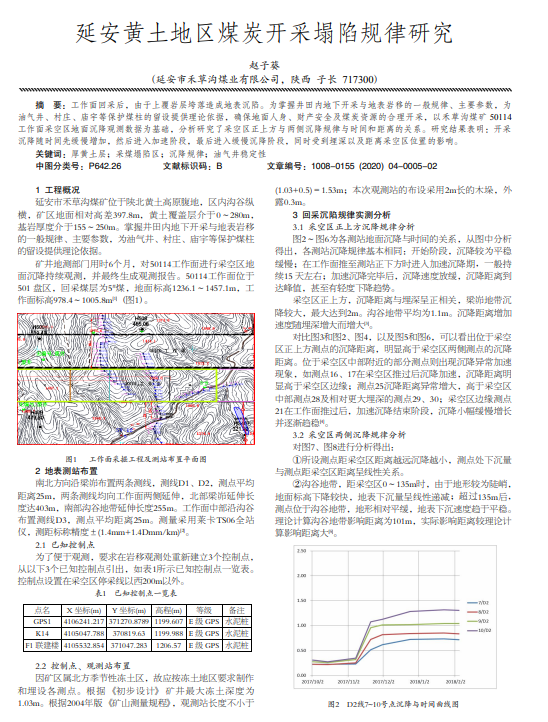 工作面回采后,由于上覆岩层垮落造成地表沉陷。为掌握井田内地下开采与地表岩移的一般规律、主要参数,为 油气井、村庄、庙宇等保护煤柱的留设提供理论依据,确保地面人身、财产安全及煤炭资源的合理开采,以禾草沟煤矿 50114 工作面采空区地面沉降观测数据为基础,分析研究了采空区正上方与两侧沉降规律与时间和距离的关系。研究结果表明:开采 沉降随时间先缓慢增加,然后进入加速阶段,最后进入缓慢沉降阶段,同时受到埋深以及距离采空区位置的影响。