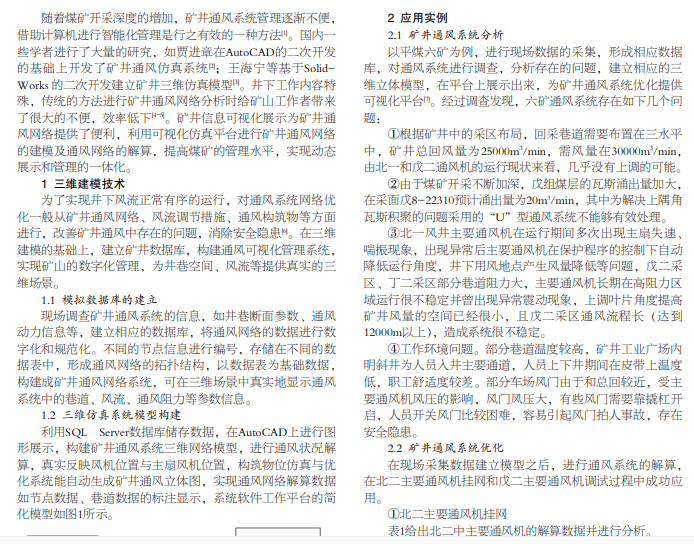 为解决矿井通风系统场景复杂、显示困难等问题,通过动态仿真软件实现井巷工程、井上下通风设备设施的一体 化真实再现,为通风系统风流、风向、风质的显示提供真实的三维场景,进行矿井通风系统管理。以平顶山六矿为例,建立一 个合理的数据库,开发通风网络解算功能,系统可通过计算得出各台风机和整个矿井的风量,据此增加优化结果的可靠度,提 升矿井通风安全管理水平。