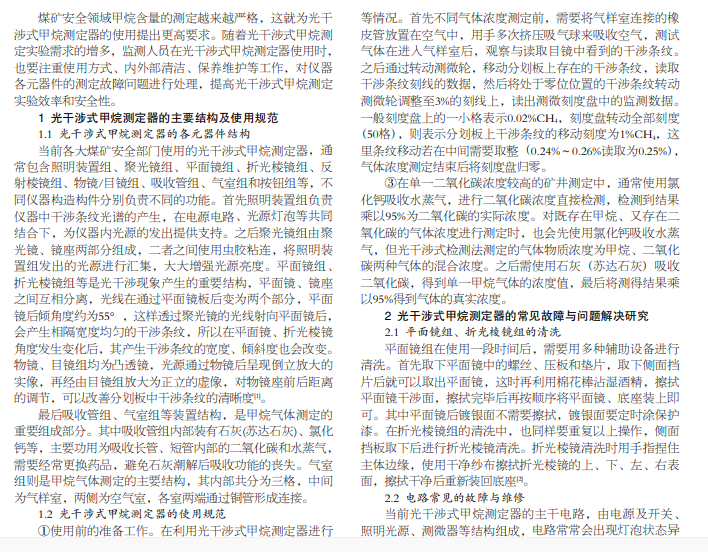 光干涉式甲烷测定器通常被用于煤矿井中,对甲烷等气体含量进行仪器测量,通过对甲烷气体在计量仪器内折射 率的变化状况,进行定量监测与分析,来完成不同时段甲烷气体成分、气体浓度的测量。光干涉式甲烷测定器在煤矿井下使用 时,需要对仪器气密性、物镜 / 目镜、吸管、气室、电路等组成结构中出现的故障问题进行分析与解决,保障光干涉式甲烷测 定的准确性。