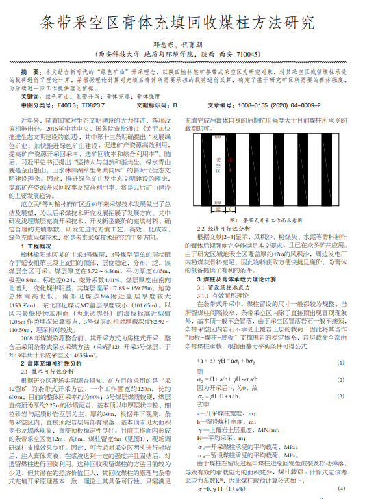 本文结合新时代的“绿色矿山”开采理念,以陕西榆林某矿条带式采空区为研究对象,对其采空区残留煤柱承受 的载荷进行了理论计算,并根据理论计算对充填后膏体所需要承担的载荷进行反算,确定了基于研究矿区所需要的膏体强度, 为后续进一步工作提供理论依据。