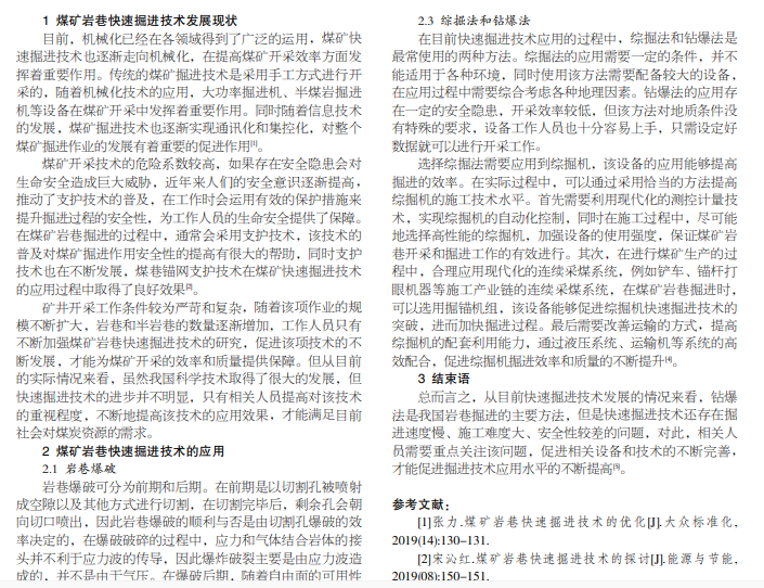 作为化石能源重要的组成部分,煤炭资源是我国重要的能源和化工原料,对我国经济的发展有着重要影响。随着 我国经济的快速发展,对煤炭资源的需求也在增加,只有不断发展掘进与开采技术,才能满足我国社会发展的需求。对此,本 文主要探讨了目前大多数企业采用的快速掘进技术,分析了目前该技术发展现状和应用,希望对我国煤矿岩巷的开采有所帮 助,促进煤炭开采效率和质量的不断提高。