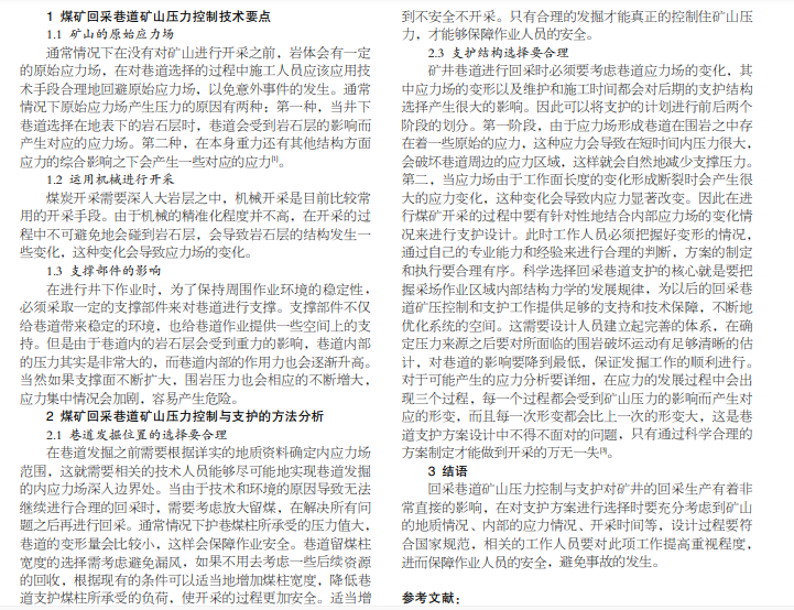 随着国家经济的不断发展,煤炭的应用也越来越多,但是在现实生产环境下,由于井下的地质环境比较复杂,操 作过程中如果出现失误很有可能导致人员伤亡。如何对煤矿回采巷道矿山压力进行合理控制、如何做好后期的支护工作变得非 常重要。本文从煤矿回采巷道矿山压力控制技术出发,论述了如何进行煤矿回采巷道矿山压力的控制与支护。