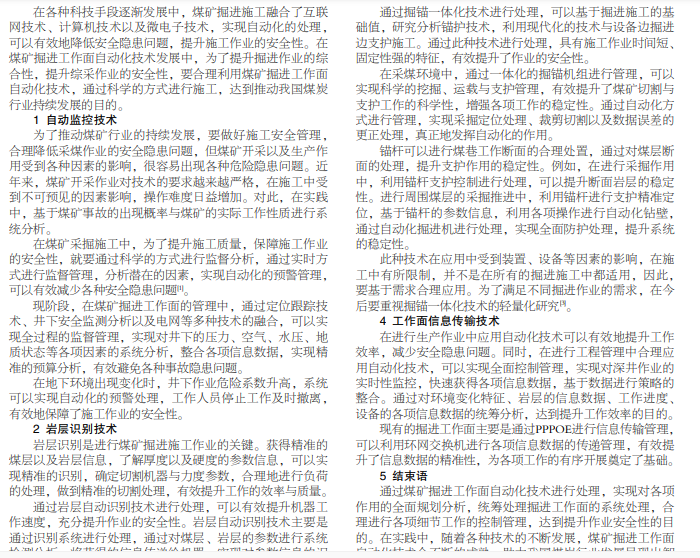 煤炭资源在我国生产生活中具有重要的作用。在资源紧缺问题的影响之下,通过科学的方式进行管理,改进煤矿 掘进施工作业,通过自动化的方式进行处理,可以有效提升煤矿作业的安全性。基于此,文章主要对煤矿掘进工作面自动监控 技术、岩层识别技术、掘锚一体化技术、工作面信息传输技术进行了简单的分析。