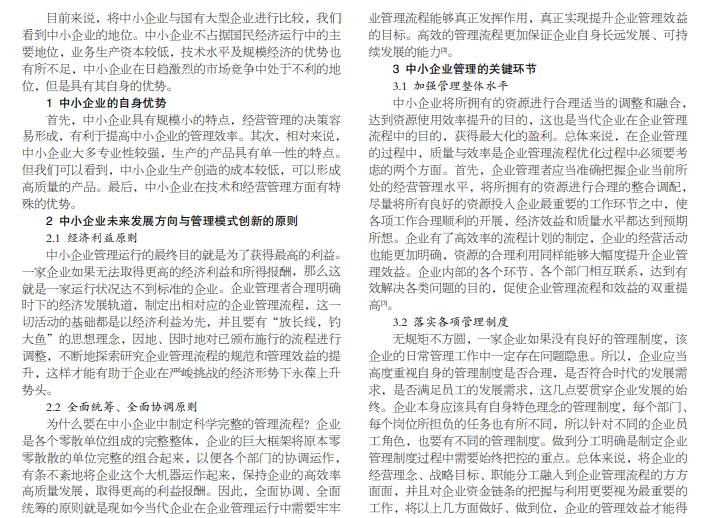 在大时代大背景下,我国经济发展水平稳步上升,中小企业单位也紧跟经济发展步伐。但在喜人的前景下,我们 也必须看到发展过程中面临的各项挑战和遭遇的各种瓶颈,这其中最为关键的就是如何规划好中小企业未来的发展方向与创新 企业的管理模式。我们知道获得利润是企业运作的主要目的,让企业获得最大化的经济效益需要制定与实施科学的管理流程, 为企业未来的发展奠定方向。本文主要从流程和效益的关系引入,辅之简述企业管理中需要遵循的各项原则,旨在深入探讨中 小企业的未来发展方向和管理模式的创新。