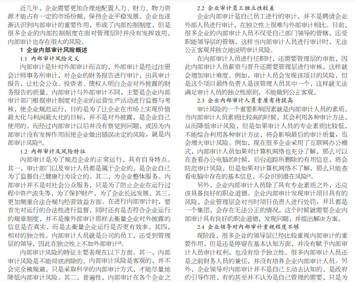 随着经济发展,企业也逐渐认识到内部审计的重要作用,开始着手内部审计,但是很多企业内部审计并不能充分 发挥作用,达不到内部监督的作用。文章从企业内部审计风险的概述入手,论述内部审计风险的定义以及特征,从企业的角度 来分析企业内部审计风险成因,最后提出有针对性的、具体的防控风险建议。