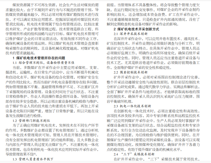煤矿企业机械化水平会直接影响市场竞争实力,还会决定企业生产效率与质量。通过创新改革煤矿机电技术管理, 可以确保煤矿开采作业的可靠性和安全性。此次研究主要分析煤矿机电技术管理所存在的问题,同时提出管理创新与应用措 施,希望可以对相关人员起到参考性价值。