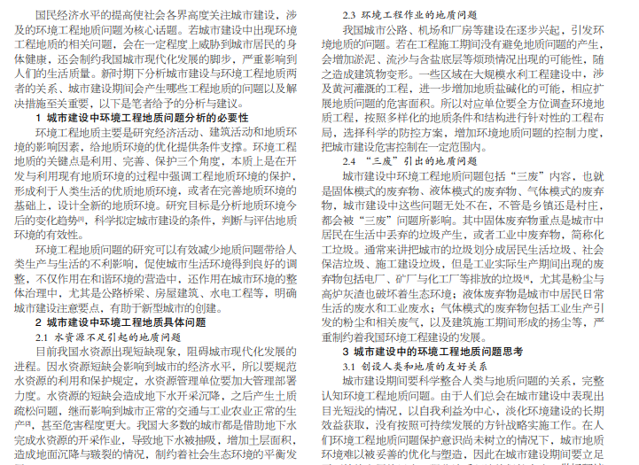 本文主要以城市建设中的环境工程地质问题为重点进行阐述,以当下城市建设发展现状为依据,首先论证城市建 设中环境工程地质问题分析的必要性,其次从水资源不足、水质污染、环境工程作业、“三废”几个方面深入说明并探讨城市 建设中环境工程地质问题,最后阐述城市建设中的环境工程地质问题思考,包括创设人类和地质的友好关系、整合地质环境质 量以及容量、加强环境工程地质施工操作,减少环境工程地质问题的出现,旨在为相关研究提供参考资料。