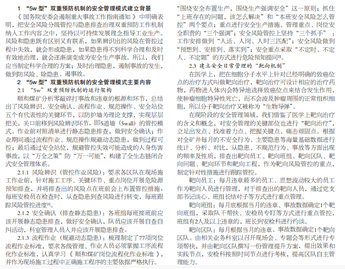 近年来国家大力推进构建安全风险分级管控和隐患排查治理的双重预防机制,顺和煤矿建立以“辨识风险 (管控 作业风险)、安全确认 (排查静态隐患)、流程作业 (规避动态隐患)、规范操作 (规避动态隐患)、安全站位 (切断事故链)”为 核心的“5w” (5wall) 即“五道关口”双重预防体系,丰富了双重预防机制的模式和手段,在此基础上完善了安全管理举措, 把风险管控挺在隐患前面,把隐患排查挺在事故前面,促进煤矿企业安全管理效果持续向好。