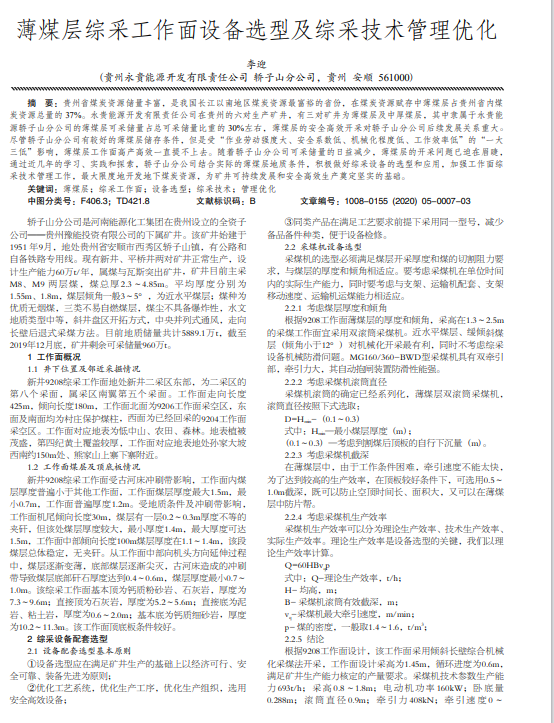 贵州省煤炭资源储量丰富,是我国长江以南地区煤炭资源最富裕的省份,在煤炭资源赋存中薄煤层占贵州省内煤 炭资源总量的 37%。永贵能源开发有限责任公司在贵州的六对生产矿井,有三对矿井为薄煤层及中厚煤层,其中隶属于永贵能 源轿子山分公司的薄煤层可采储量占总可采储量比重的 30%左右,薄煤层的安全高效开采对轿子山分公司后续发展关系重大。 尽管轿子山分公司有较好的薄煤层储存条件,但是受“作业劳动强度大、安全系数低、机械化程度低、工作效率低”的“一大 三低”影响,薄煤层工作面高产高效一直提不上去。随着轿子山分公司可采储量的日益减少,薄煤层的开采问题已迫在眉睫, 通过近几年的学习、实践和探索,轿子山分公司结合实际的薄煤层地质条件,积极做好综采设备的选型和应用,加强工作面综 采技术管理工作,最大限度地开发地下煤炭资源,为矿井可持续发展和安全高效生产奠定坚实的基础。