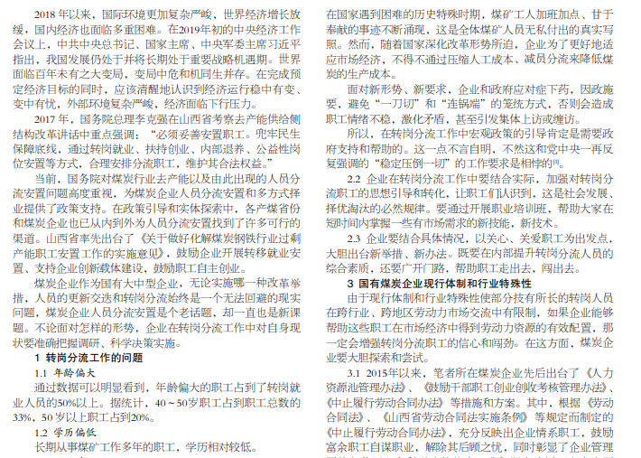 国有煤炭企业在共和国几十年的发展建设中,为国家建设付出了几代人的汗水和心血。由于历史原因,在观念、体 制和管理等方面,形成了一个内部小社会。企业机构和职工队伍不断扩大,冗员多、负担重、污染重、效益差等问题逐渐在今 天激烈的市场经济环境中暴露出来,和国家提出的绿色建设目标相距甚远,也成为制约企业发展的核心问题。如何做好企业转 岗分流工作,妥善解决出现的各类问题和矛盾?笔者以所在国有企业为佐证,结合掌握的资料,对转岗分流这一工作提出了粗 浅的分析和思考。