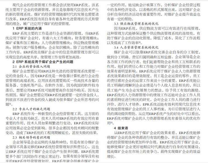 ERP 系统的前身是 MRP 系统,早在 20 世纪 60 年代 ERP 系统的管理概念就开始产生。随着时代的发展,MRP 系 统依靠现代计算机技术革新成为可以应用于企业经营管理的 ERP 系统。煤矿企业为了寻求进步,也开始重视进行企业资源管理 工作,ERP 系统在经营管理上能给予煤矿企业很好的帮助。