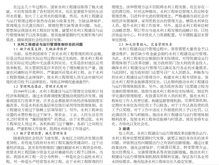 随着社会经济飞速发展,使农业、工业、生活用水需求量逐渐加大,导致传统水利工程管理无法适应当前社会发 展。针对这种情况水利工程建设与运行管理体制必须与时俱进,根据当前水利工程建设与运行管理存在的问题,提出行之有效 的创新路径,促使我国水利工程能够长久稳定发展。本文将对水利工程建设与运行管理体制创新路径予以分析探究。