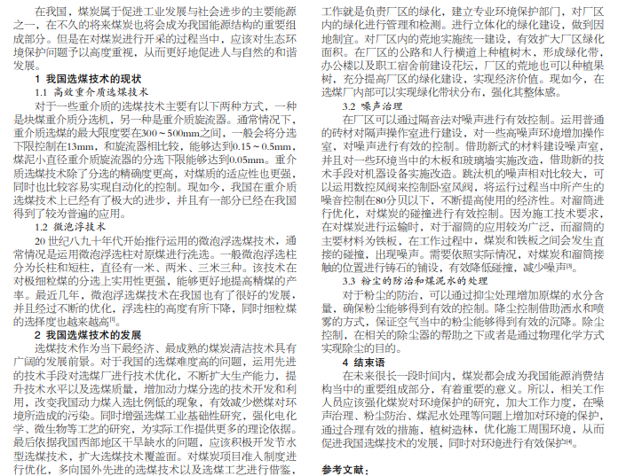 选煤工业是煤炭行业的重要组成部分,我国的选煤工业发展得比较晚,在 20 世纪 50 年代才开始拥有属于自己的 选煤工业。处理好选煤与环境保护两者之间的协调关系,对促进煤炭企业与环境保护两者的协调发展具有重要意义,对于带动 国民经济发展也有着极大的促进作用。本文主要对我国的选煤技术的发展与环境保护策略进行简要分析,希望能够对后续工作 起到一定的参考性意义。