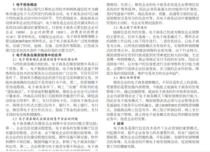 电子商务 (E-Commerce) 是随着互联网技术的发展而发展起来的,是以计算机应用技术和网络通信技术为基础、 以交易双方为主体、以电子支付和支付结算为手段,以现代物流运输体系为依托的全新商务模式,目前在商品交易中得到了广 泛应用。近年来,随着电子商务的快速发展,煤炭行业必须与时俱进,依据自己的行业特点,利用电子商务手段实现网络营销, 并通过电子商务技术手段,发布煤炭商品信息,实施客户管理和客户服务,开展支付结算等项业务,以扩大煤炭商品的销售力 度和市场占有率。为此,本文对利用电子商务做好煤炭的销售策略进行分析。