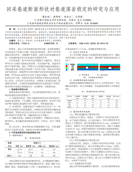针对内蒙古某煤矿 10# 煤层高应力和软围岩的地质条件,运用 FLAC3D 数值模拟软件对回采巷道梯形和拱形 2 种 不同形式的断面进行数值模拟研究,结果证明:梯形巷道的变形原因主要是顶板的下沉,而拱形巷道的变形原因主要在于两帮 移近和底鼓现象;拱形断面巷道的抗变形能力要远优于梯形断面巷道;结合该矿高应力软围岩的特殊地质条件,将原来的梯形 巷道断面优化为拱形巷道断面,并在现场进行了实际应用,取得了较好的效果。