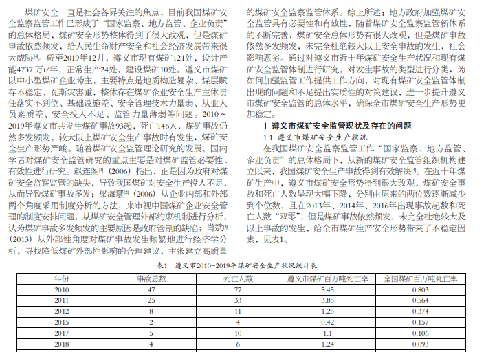 文章介绍了国内学者有关煤矿安全监管必要性和有效性研究成果,从煤矿安全监管的角度,运用遵义市近十年煤 矿安全生产数据,对遵义市煤矿安全生产现状进行研究。结果表明:遵义市煤矿安全形势得到很大改观,煤矿安全事故和死亡 人数大幅下降,但也存在监管体制不完善、监管力量薄弱、煤矿安全监管与执法分离、煤矿企业安全主体责任落实不到位等问 题。针对遵义市煤矿安全监管存在的问题,提出建议和对策,进一步提升遵义市煤矿安全监管水平,确保煤矿安全生产形势更 加稳定。