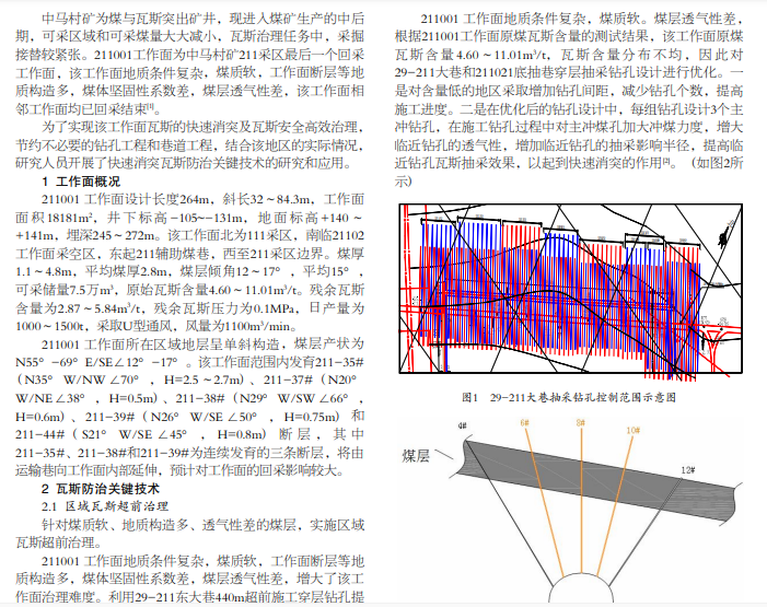 为了解决中马村矿 211001 工作面瓦斯防治问题,依据瓦斯地质条件、采掘巷道布置情况的实际施工条件,借鉴相 关技术和经验,超前施工穿层钻孔预抽工作面瓦斯,布置顺层钻孔预抽应力集中带瓦斯,并针对不同含量地点布置主抽、主冲 煤钻孔,优化布置间距,采用“隔列施工法”优化钻孔施工顺序。上述技术有效提高钻孔施工效果,工作面实现安全生产。
