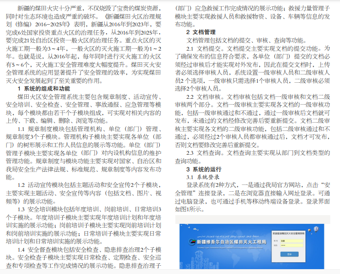 煤田灭火安全管理系统,在我局灭火施工安全管理过程中发挥积极作用。文章阐述了该系统规章制度、活动宣传、 安全培训、安全检查、安全管理、事故通报、应急管理等模块的组成和功能,介绍了文档的提交、审核和查询功能,探讨了系 统的运行效果。