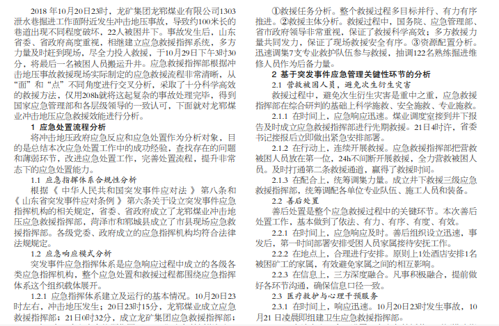 本文从应急处置流程分析、基于突发事件应急管理关键性环节的分析、应急救援全过程效能分析展开论述,目的是 通过分析本次事故应急救援的成功之处,用以指导今后的事故救援,确保安全高效地完成救援任务。