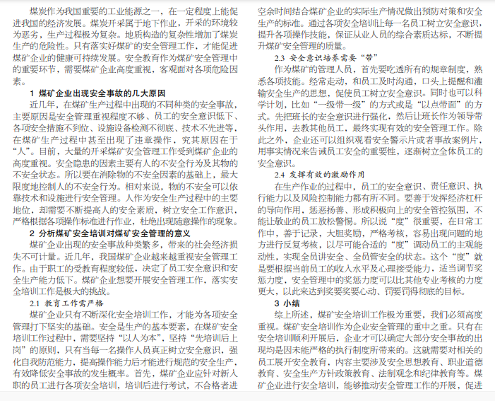 对于煤矿来说,安全是最为重要的生存底线。想要避免安全事故的发生,就需要做好煤矿安全培训工作,做好煤 矿安全管理的各项措施。根据我国煤矿企业的发展情况,企业管理还需要对安全培训工作进一步深化。只有不断强化煤矿安全 培训工作才能提高全体人员的综合素质,为煤矿安全管理打下坚实的基础。本文探究了煤矿安全培训对煤矿安全管理的价值。