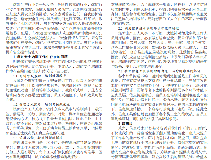 一提到煤矿,相信很多人会将其与危险等负面词汇联系起来。煤矿生产过程中确实隐藏着许多危险因素,稍有不 慎,便有可能造成安全事故。近年来,国家对于煤矿安全给予了充分的重视,并陆续出台了相关的法律法规来约束煤矿生产经 营行为。与此同时,煤矿也应当意识到安全的重要性,对员工加以培训。本文立足于信息时代背景,首先分析了煤矿单位安全 培训工作中存在的问题,其次就做好煤矿安全教育培训的途径进行了探讨。