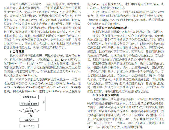 针对倾斜煤层上覆采空区积水危害较大的问题,提出了针对性治理的技术路线,以先期认知为基础,通过开展瞬 变电磁探测查明采空区含水性,并依据探测成果初步设计钻孔;再结合井下现场工况条件优化钻孔,通过钻孔查明采空区底部 边界;同时开展排放水作业,查明净水位并排空采空区积水,从而消除了采空区积水的威胁,对于保障煤矿安全生产意义重 大。