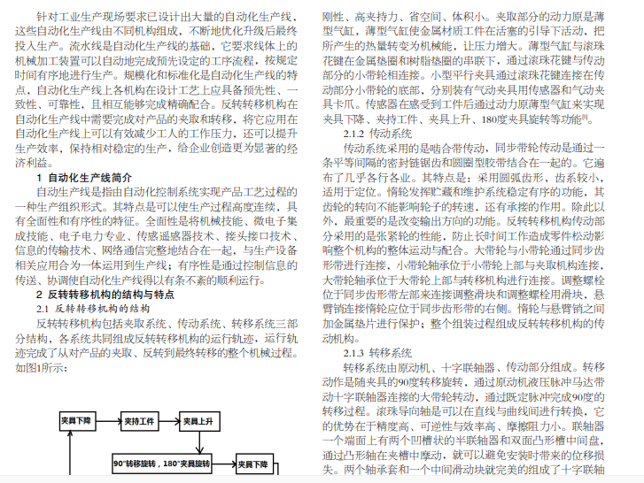 机械制造业近几年实现了迅猛发展,逐渐呈现出批量化、规模化、标准化的趋势,自动化生产将逐步取代手动作 业,所以完善自动化为全自动化已是工业生产的大势所趋。反转转移机构借助类比机械手臂的工作原理在自动化生产线上完成 夹取与反转转移工序,通过夹取和改变工件的旋转转移装置来替代人工作业。它的益处是节省了人力、物力、财力,实现了生 产制造的全面自动化。