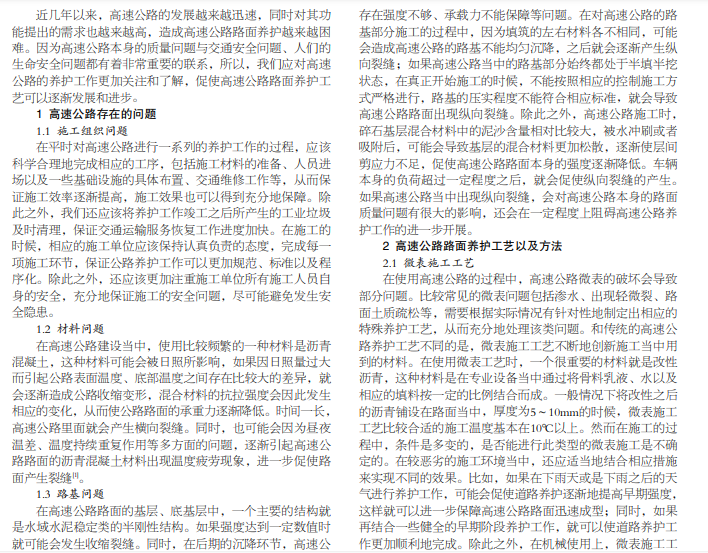 院 我国经济正处于不断发展当中,交通也越来越发达,高速公路数量逐渐地增多,对高速公路路面养护工艺技术提 出的要求也越来越高。当前高速公路中,有一部分已经出现老化、损害等的问题,可能会在很大程度上影响路面的质量,导致 安全不能够得到保证。本文就高速公路使用寿命的增加、路面养护工艺及相应的养护措施来进行具体分析和探究。