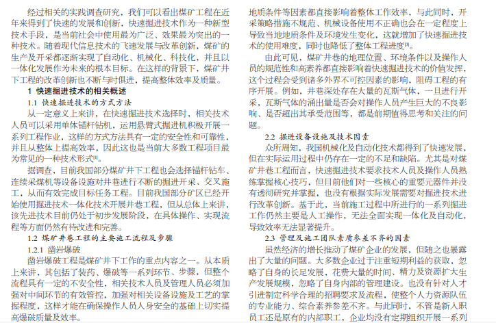 本文首先就快速掘进技术的内涵、流程步骤进行了相关概述,其后深入分析了阻碍煤矿井巷工程快速掘进技术有 效运用的主要因素,最后提出了一系列提高煤矿井巷工程中快速掘进技术运用效率的途径及策略。