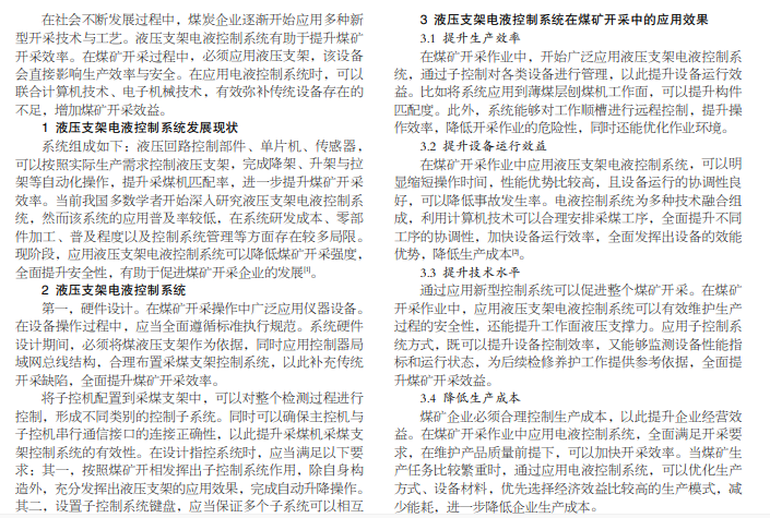 为了提升市场竞争力,煤炭企业必须优化改进现有生产工艺与技术,不断提升煤矿开采效率。在煤矿开采中应用 液压支架电液控制系统,可以有效弥补传统开采技术存在的不足,全面提升开采效率。