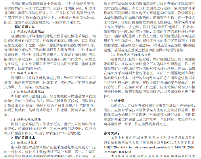 随着我国经济不断发展,科学技术水平也有了显著的提升,对煤炭的需求量也在逐渐增加,为了能够更好地保证 采煤工作的顺利进行,对采煤方法进行优化、提高采煤技术十分有必要。文章为如何对采煤方法和采煤技术进行合理的选择提 出意见和建议。
