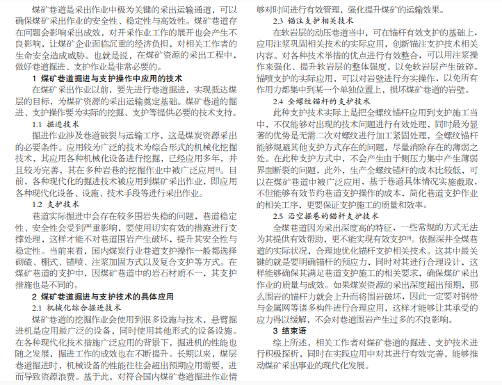 在煤矿采出作业中,巷道的挖掘、支护施工非常重要,为煤矿采出作业提供安全保证。伴随着煤矿开采行业的不 断发展,采出作业的技术手段也获得了创新,其在巷道掘进、支护工作中被广泛应用,不仅保证了采出作业的安全性,同时也 保障了矿产资源的采出成效。