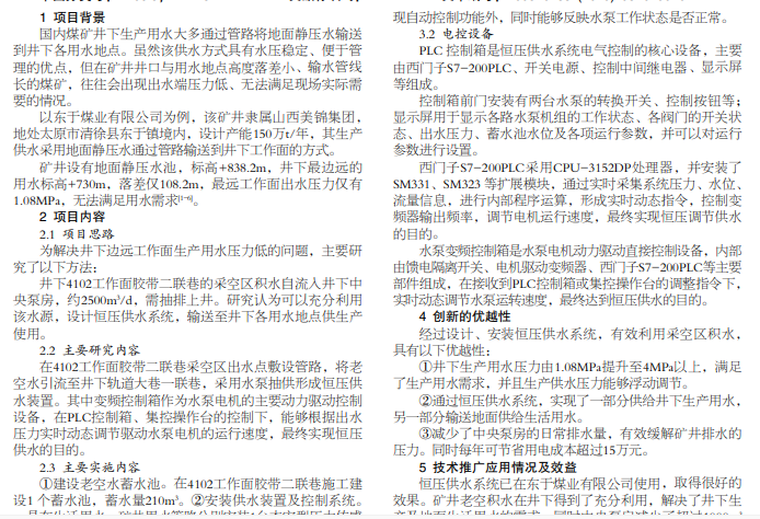 本文以东于煤业有限公司恒压供水系统为例,介绍了利用远程自动控制恒压供水技术,实现矿井老空水的循环利 用。研究设计采用可编程控制器 (以下简称 PLC) 作为程序控制核心,根据传感器实时监测出水端压力,动态调节变频器输出 频率,从而调整驱动电机的运行转速,实现恒压供水的目的。