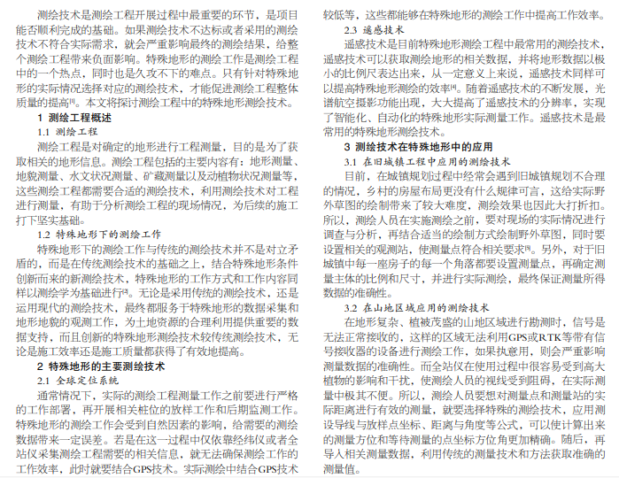 近几年,测绘工程在人们的生产及生活中的重要性逐渐凸显出来。测绘工程是社会经济发展的重要组成部分,目 前的测绘工程存在许多问题亟待解决,比如测绘技术不规范、不达标、不先进,测绘设备陈旧,测绘工程管理落后,难以对特 殊地形开展测绘工作等,人们研究最多的是特殊地形的测绘技术。本文首先对测绘工程进行简要分析,随后对测绘技术在特殊 地形中的应用进行了详细研究。