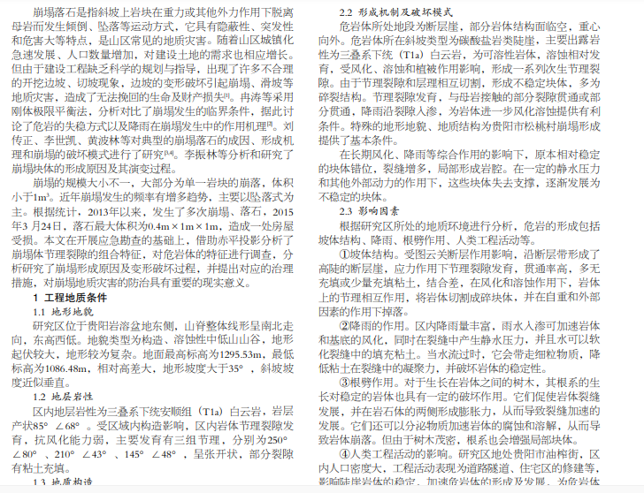 本文在对贵阳市某崩塌地质灾害工程地质调查和测绘的基础上,分析和总结了崩塌地质灾害的特征、形成机制和 破坏模式及影响因素,采用赤平投影对崩塌不利结构面组合进行分析,提出了对该崩塌地质灾害的治理措施,为地质灾害的防 治提供依据。