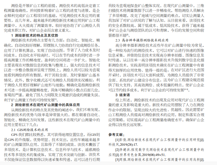 伴随科技的进步、社会的发展,测绘技术得到了重视,新技术不断涌现,这些新技术投入现代矿山工程测量作业 中,较大程度提高了工作效率,为矿山测量人员带去了便利。不仅如此,测绘新技术的应用,也使得开采的矿物质量得到了提 高,为矿山企业盈利提供了保障。本文针对测绘新技术在现代矿山工程测量中的应用进行深入探究,仔细探究并阐述测绘新技 术的特点。