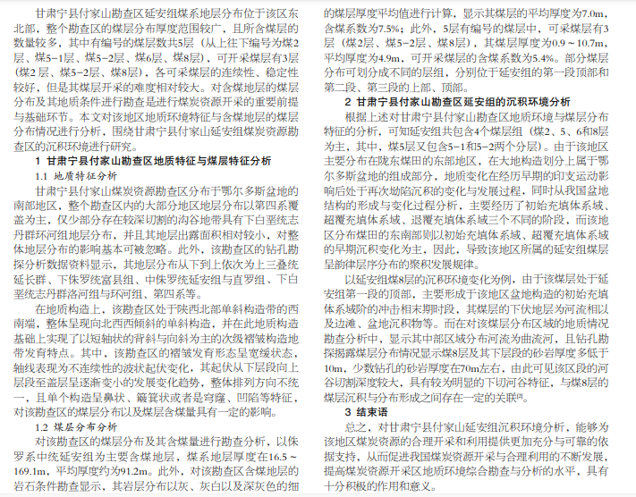 甘肃宁县付家山勘查区延安组的煤系地层分布与煤层赋存情况,与勘查区内的地层特征、地质构造及沉积环境具 有密切关系。本文结合甘肃宁县付家山延安组的煤系地层与煤层沉积特征,对该地区的沉积环境进行分析研究,以期对本区煤 炭资源的勘查、开发与利用提供理论与实际的指导意义。