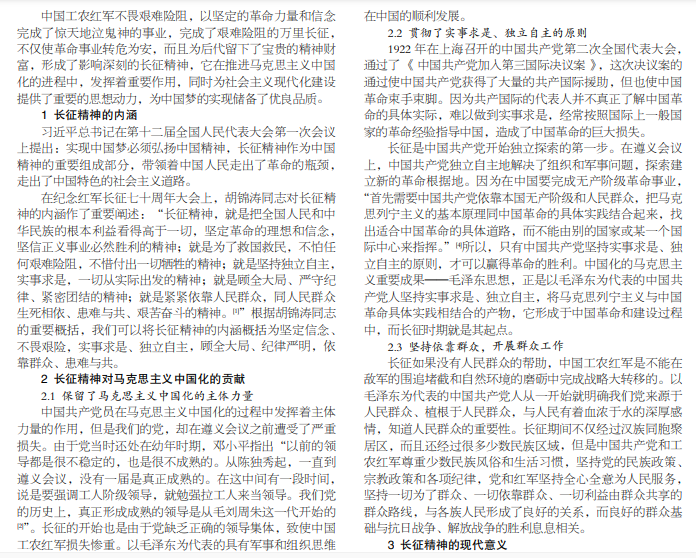 长征精神来源于中国工农红军不畏艰险、实事求是、独立自主,以坚定的理想信念完成的二万五千里的长征实践 当中,也是马克思主义中国化过程当中不可或缺的一部分。重拾经典,深刻认识长征精神对马克思主义中国化的重大贡献,丰 富马克思主义中国化的内涵,助力中华民族伟大复兴的中国梦。