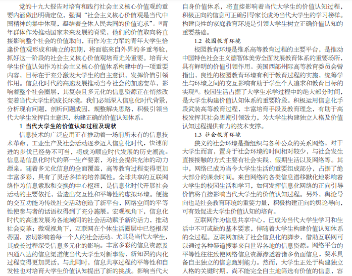 大学生价值认知的培育是践行社会主义核心价值观的重要任务。信息化时代丰富了大学生价值认知培育的内容及 方式,在为其拓展新思路的同时,也带来诸多负面影响。本文分析当代大学生的价值认知过程及现状,结合时代特征探究信息 多元化对培育大学生价值认知的驱动作用,并提出正确引领价值认知的有效途径。