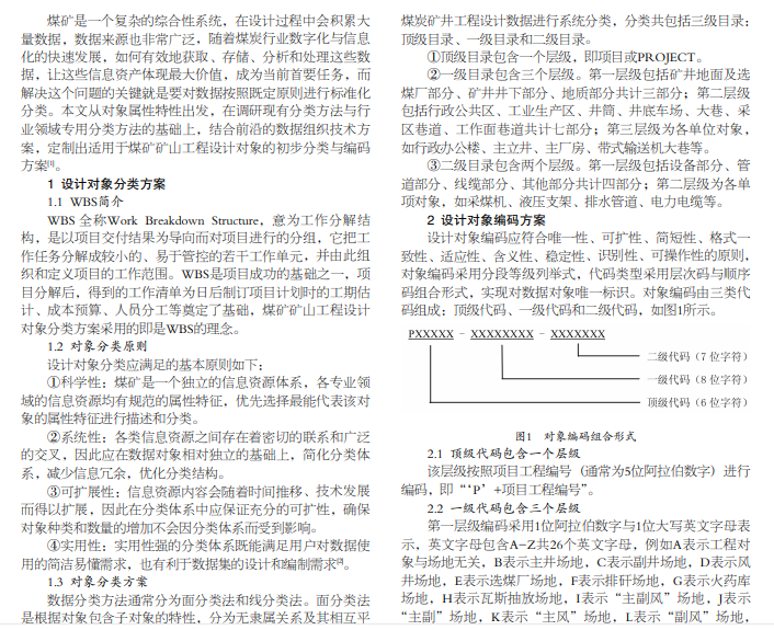 为了提升煤矿矿山工程数字化设计能力,促进信息化系统的建设,基于 WBS 工作分解结构原理,提出一种矿山 工程设计对象分类及编码方案,该方案的实施实现了三维工程设计过程中信息模型的快速遍历以及模型数据的快速查询与共 享,验证了分类及编码方案的可行性。