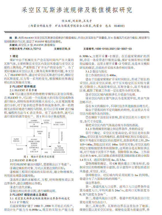 利用 FLUENT 对采空区瓦斯渗流规律进行数值模拟,并且比对实际生产测量值,对 U 型通风方式进行模拟,将结果与 现场数据进行比对,验证了 FLUENT 模拟的准确性。